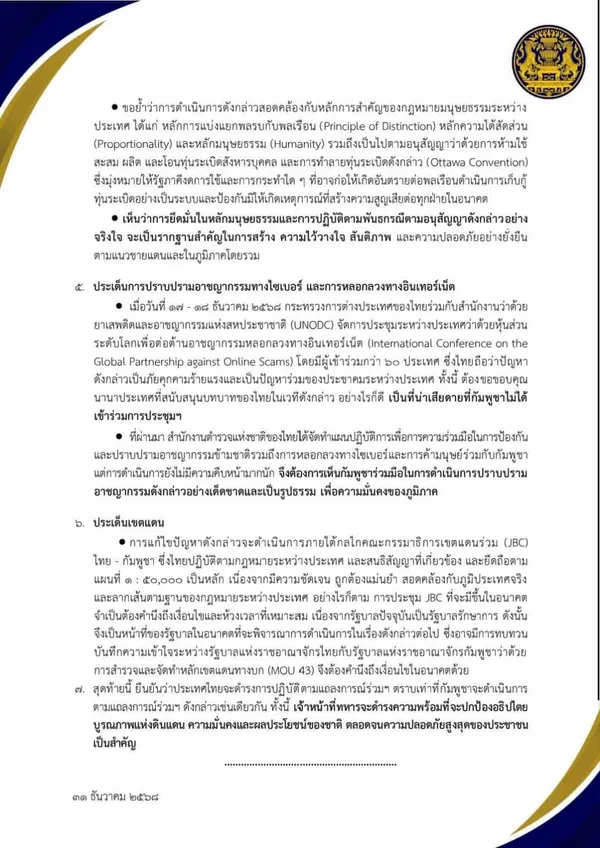 6. ประเด็นเขตแดน การแก้ไขปัญหาดังกล่าวจะดำเนินการภายใต้กลไกคณะกรรมาธิการเขตแดนร่วม (JBC) ไทย - กัมพูชา ซึ่งไทยปฏิบัติตามกฎหมายระหว่างประเทศ และสนธิสัญญาที่เกี่ยวข้อง และยึดถือตาม แผนที่ 1:50,000 เป็นหลัก เนื่องจากมีความชัดเจน ถูกต้องแม่นยำ สอดคล้องกับภูมิประเทศจริงและลากเส้นตามฐานของกฎหมายระหว่างประเทศ