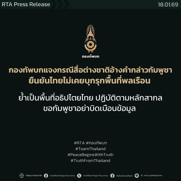 กองทัพบกขอให้ฝ่ายกัมพูชานำเสนอข้อมูลอย่างตรงไปตรงมา ไม่บิดเบือนข้อเท็จจริง เพื่อไม่ให้สังคมเกิดความเข้าใจคลาดเคลื่อนและไม่กระทบต่อภาพลักษณ์ของฝ่ายไทย รวมถึงบรรยากาศของความร่วมมือ