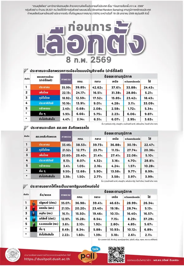 “สวนดุสิตโพล” มหาวิทยาลัยสวนดุสิต สำรวจความคิดเห็นประชาชนทั่วประเทศ เรื่อง “ก่อนการเลือกตั้ง 8 ก.พ. 2569” ระหว่างวันที่ 16-28 มกราคม 2569 พบว่า พรรคการเมืองแบบบัญชีรายชื่อ (ปาร์ตี้ลิสต์) ที่กลุ่มตัวอย่างจะเลือก คือ พรรคประชาชน 35.99% รองลงมาคือ เพื่อไทย 22.13% ภูมิใจไทย 18.92% ด้าน สส. เขต จะเลือกสังกัดพรรคประชาชน 33.46% รองลงมาคือ ภูมิใจไทย 21.52% เพื่อไทย 20.60% และอยากให้นายณัฐพงษ์ เรืองปัญญาวุฒิ (ปชน.) เป็นนายกรัฐมนตรี 35.07% รองลงมาคือ นายยศชนัน วงศ์สวัสดิ์ (พท.) 21.53% และนายอนุทิน ชาญวีรกูล (ภท.) 16.11%