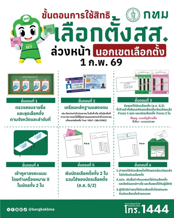 โดย กรุงเทพมหานคร แนะนำขั้นตอนการใช้สิทธิเลือกตั้ง สส. ล่วงหน้า (นอกเขตเลือกตั้ง) สำหรับผู้ที่ลงทะเบียนเลือกตั้งล่วงหน้านอกเขตเลือกตั้งไว้ สามารถใช้สิทธิลงคะแนนได้ วันอาทิตย์ที่ 1 ก.พ. 69 ตั้งแต่เวลา 08.00-17.00 น. ณ หน่วยเลือกตั้งที่ท่านลงทะเบียนไว้