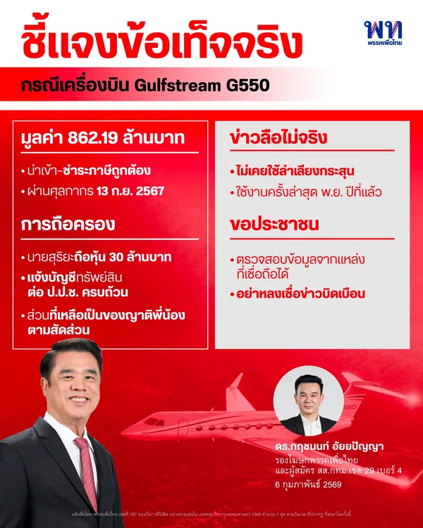 2. การแจ้งบัญชีทรัพย์สิน: นายสุริยะถือครองทรัพย์สินในเครื่องบินลำนี้ตามสัดส่วนมูลค่า 30 ล้านบาท ซึ่งได้ยื่นบัญชีแสดงรายการทรัพย์สินต่อ ปปช. ครบถ้วนชัดเจนแล้วว่า ส่วนมูลค่าที่เหลืออีกกว่า 832 ล้านบาท เป็นการถือครองโดยกลุ่มญาติพี่น้องตามสัดส่วน