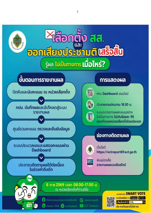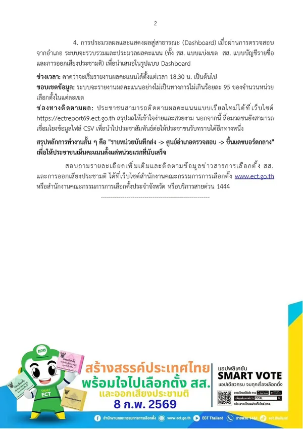 สำนักงานคณะกรรมการการเลือกตั้ง ขอประชาสัมพันธ์ภาพรวมขั้นตอนการส่งคะแนนการเลือกตั้งสมาชิกสภาผู้แทนราษฎร และการออกเสียงประชามติ วันที่ 8 กุมภาพันธ์ 2569 จากหน่วยเลือกตั้งจนถึงมือประชาชน ผ่านระบบ “ECT Report 69” ดังนี้
