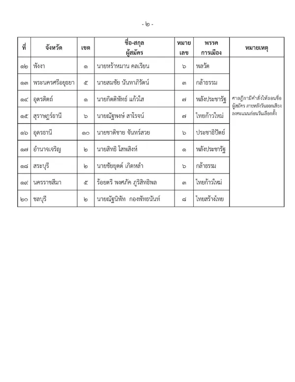 บัดนี้ ศาลฎีกามีคำสั่งให้ถอนชื่อผู้สมัครรับเลือกตั้งสมาชิกสภาผู้แทนราษฎรแบบแบ่งเขตเลือกตั้ง หรือมีคำพิพากษาให้คำวินิจฉัยของคณะกรรมการการเลือกตั้งที่ให้ถอนชื่อผู้สมัครออกจากประกาศรายชื่อผู้สมัครรับเลือกตั้งสมาชิกสภาผู้แทนราษฎร แบบแบ่งเขตเลือกตั้งชอบด้วยกฎหมายแล้ว เพิ่มเติมจำนวน 2 ราย ในลำดับที่ 19 และ 20 รวมทั้งสิ้น 20 ราย รายละเอียดตามเอกสารแนบ