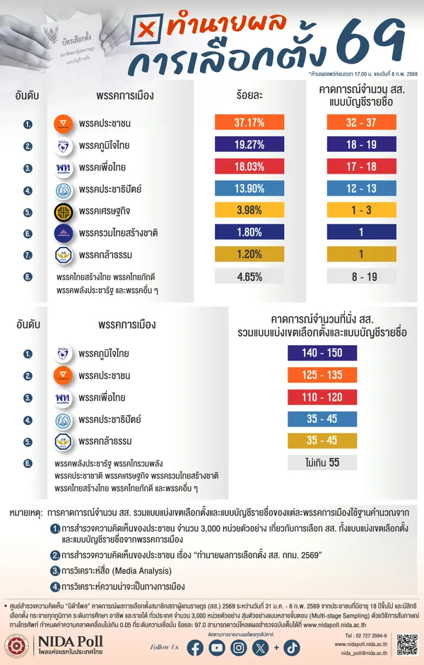 ข้อมูลจาก นิด้าโพล ซึ่งสำรวจระหว่างวันที่ 31 มกราคม–6 กุมภาพันธ์ 2569 จากประชาชน 3,000 ตัวอย่างทั่วประเทศ ระบุว่า หากวันเลือกตั้งมีขึ้นในช่วงเวลาสำรวจ พรรคประชาชนจะมีคะแนนนิยม สส.บัญชีรายชื่อสูงสุด คิดเป็นร้อยละ 37.17 ตามด้วยพรรคภูมิใจไทย ร้อยละ 19.27 และพรรคเพื่อไทย ร้อยละ 18.03