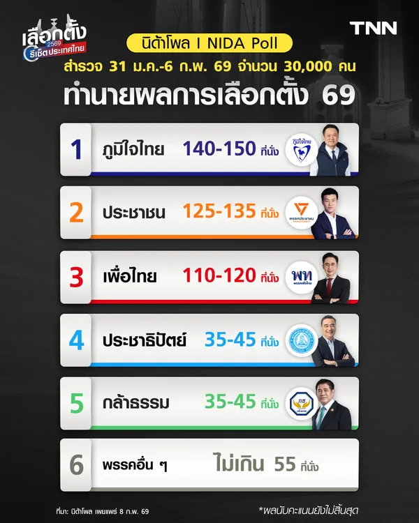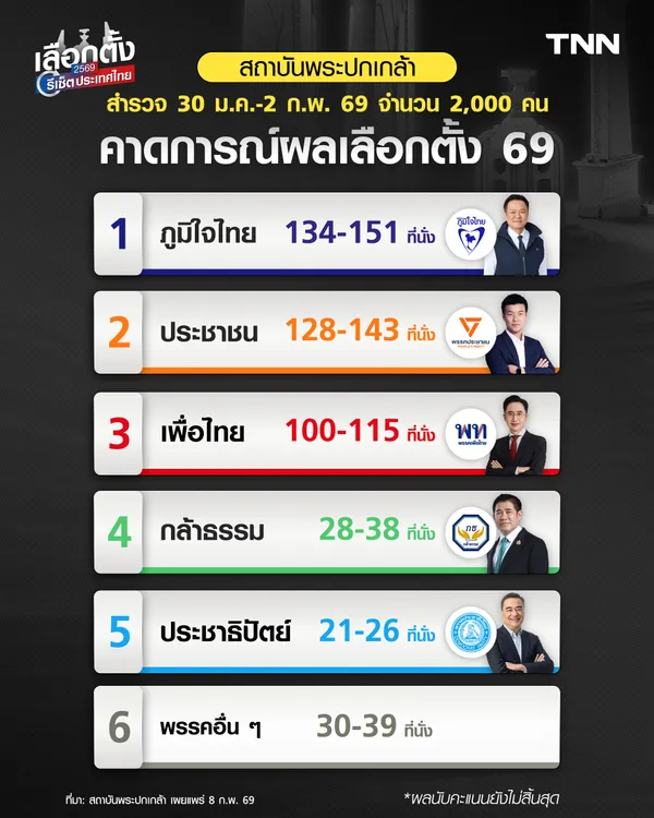 ขณะที่ผลสำรวจของสถาบันพระปกเกล้า ซึ่งเก็บข้อมูลระหว่างวันที่ 30 ม.ค.–2 ก.พ. 2569 จากกลุ่มตัวอย่าง 2,000 คน ประเมินว่า พรรคภูมิใจไทย ยังอยู่ในกลุ่มนำ คาดได้ 134–151 ที่นั่ง ตามด้วย พรรคประชาชน 128–143 ที่นั่ง และ พรรคเพื่อไทย 100–115 ที่นั่ง