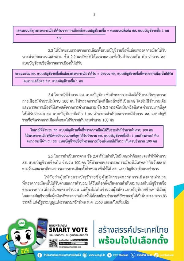 2.4 ในกรณีที่จำนวน สส. แบบบัญชีรายชื่อที่พรรคการเมืองได้รับรวมกันทุกพรรคการเมืองมีจำนวนไม่ครบ 100 คน ให้พรรคการเมืองที่มีผลลัพธ์ที่เป็นเศษ โดยไม่มีจำนวนเต็มและพรรคการเมืองที่มีเศษหลังจากการคำนวณตาม ข้อ 2.3 พรรคใดเป็นหรือมีเศษ จำนวนมากที่สุด ให้ได้รับจำนวน สส. แบบบัญชีรายชื่ออีก 1 คน เรียงตามลำดับจนกว่าจะมีจำนวน สส. แบบบัญชีรายชื่อที่พรรคการเมืองทั้งหมดได้รับรวมกันครบจำนวน 100 คน