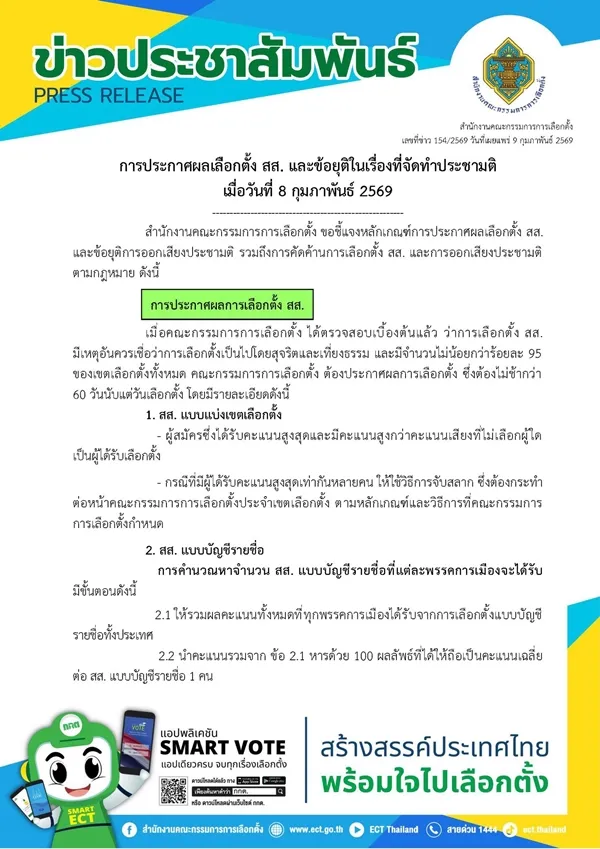 สำนักงานคณะกรรมการการเลือกตั้ง ขอชี้แจงหลักเกณฑ์การประกาศผลเลือกตั้ง สส. และข้อยุติการออกเสียงประชามติ รวมถึงการคัดค้านการเลือกตั้ง สส. และการออกเสียงประชามติตามกฎหมาย ดังนี้