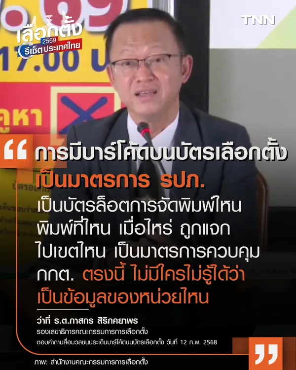 ต่อมา ว่าที่ ร.ต.ภาสกร สิริภคยาพร รองเลขาธิการคณะกรรมการการเลือกตั้ง ตอบคำถามสื่อมวลชนประเด็นบาร์โค้ดบนบัตรเลือกตั้ง วันที่ 12 ก.พ. 2568 ว่า "การมีบาร์โค้ดบนบัตรเลือกตั้ง เป็นมาตรการ รปภ. เพื่อให้รู้ว่า เป็นบัตรล็อตสำหรับการจัดพิมพ์ เพื่อทราบว่า พิมพ์ที่ไหน เมื่อไหร่ ถูกแจกไปเขตไหน เป็นมาตรการควบคุมของ กกต. ตรงนี้ จะไม่มีใครไม่สามารถรู้ได้ว่า เป็นข้อมูลของหน่วยไหน"