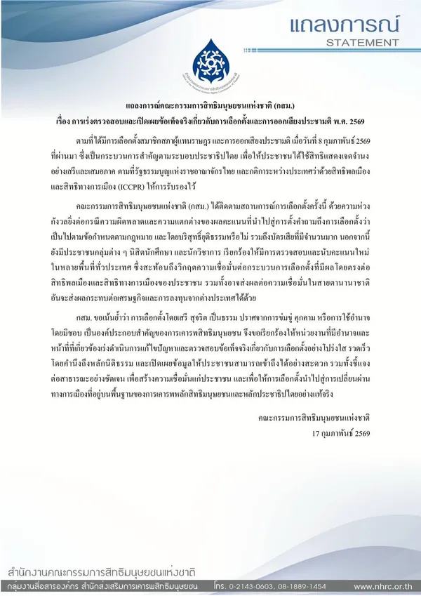 17 กุมภาพันธ์ 2569 คณะกรรมการสิทธิมนุษยชนแห่งชาติ (กสม.) ออกแถลงการณ์เรื่อง การเร่งตรวจสอบและเปิดเผยข้อเท็จจริงเกี่ยวกับการเลือกตั้งและการออกเสียงประชามติ พ.ศ. 2569