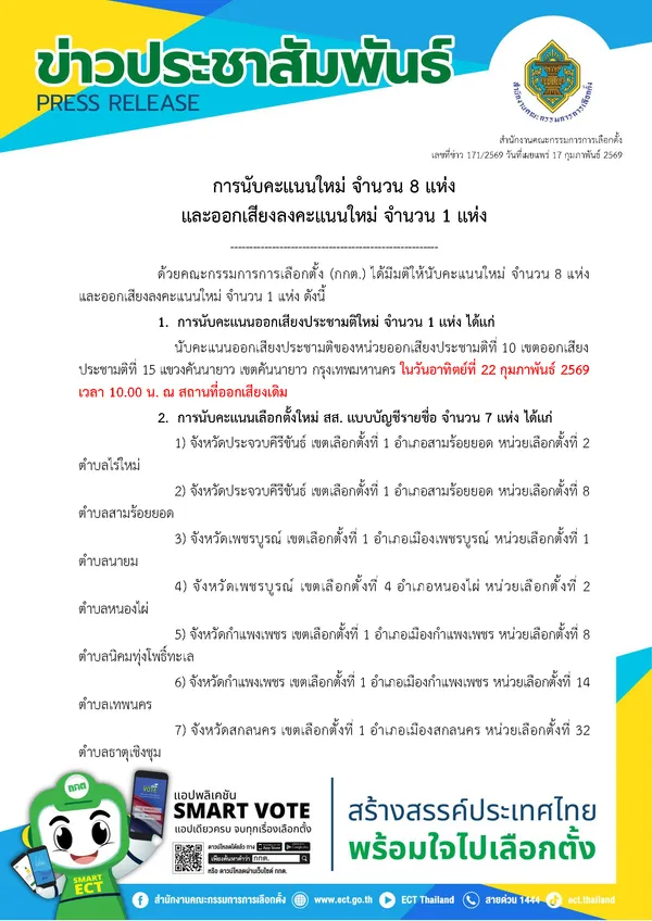 นับคะแนนใหม่ จำนวน 8 แห่ง และออกเสียงลงคะแนนใหม่ จำนวน 1 แห่ง