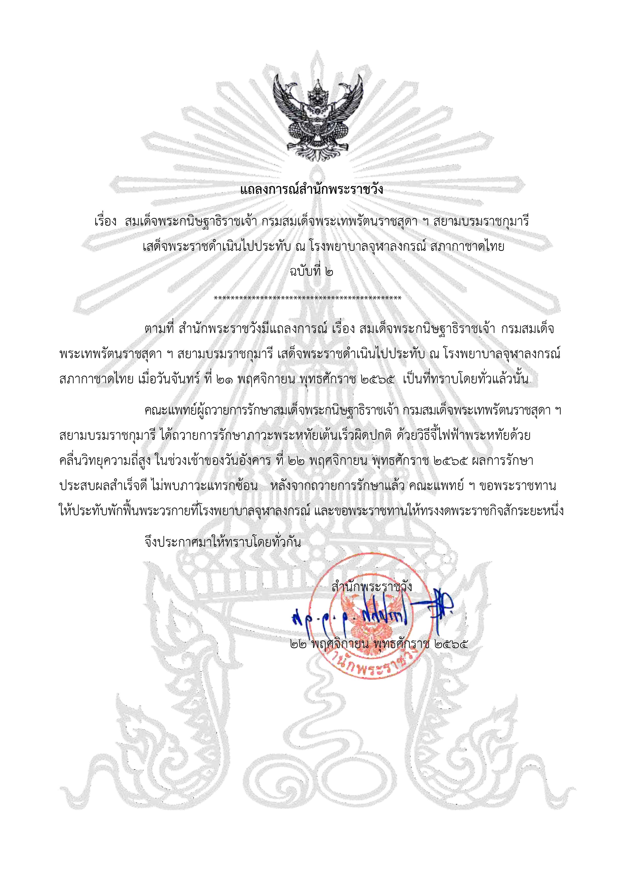 ตามที่ สำนักพระราชวังมีแถลงการณ์ เรื่อง สมเด็จพระกนิษฐาธิราชเจ้า กรมสมเด็จพระเทพรัตนราชสุดา ฯ สยามบรมราชกุมารี เสด็จพระราชดำเนินไปประทับ ณ โรงพยาบาลจุฬาลงกรณ์ สภากาชาดไทย เมื่อวันจันทร์ ที่ 21 พฤศจิกายน 2565 เป็นที่ทราบโดยทั่วแล้วนั้น