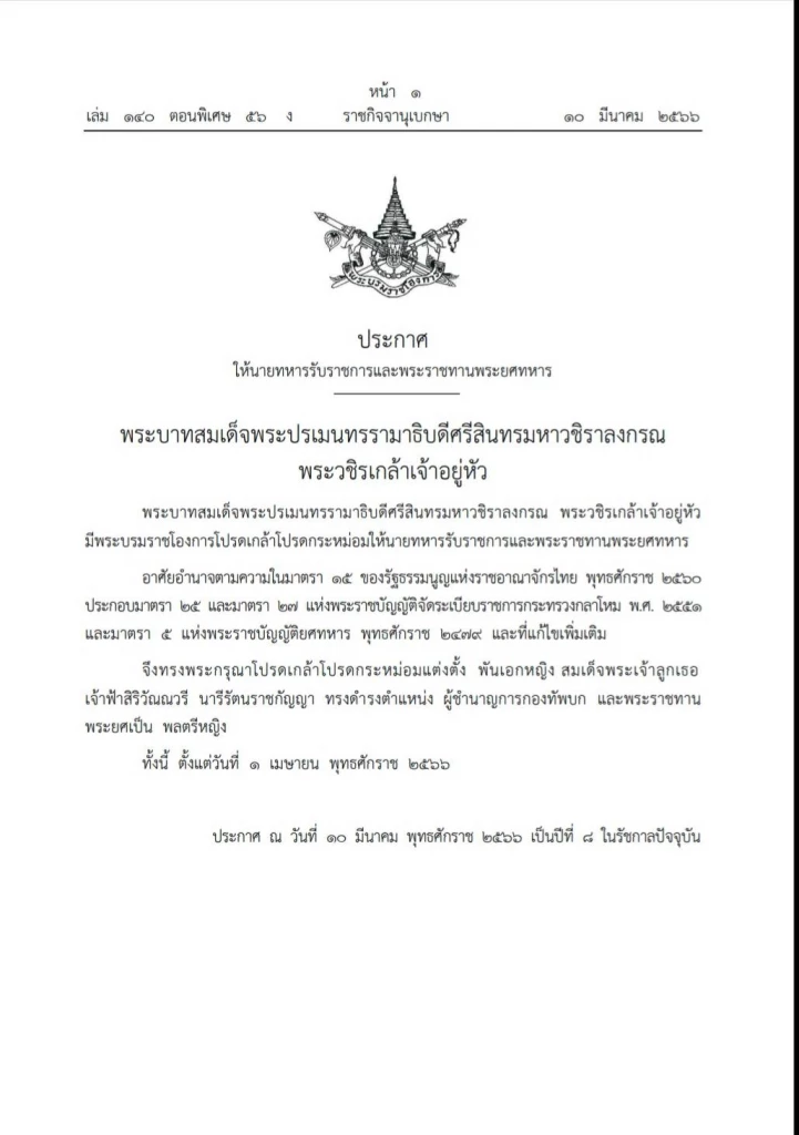 เมื่อวันที่ 10 มี.ค.2566 เว็บไซต์ราชกิจจานุเบกษา เผยแพร่ พระบรมราชโองการ ประกาศ ให้นายทหารรับราชการและพระราชทานพระยศทหาร ความว่า