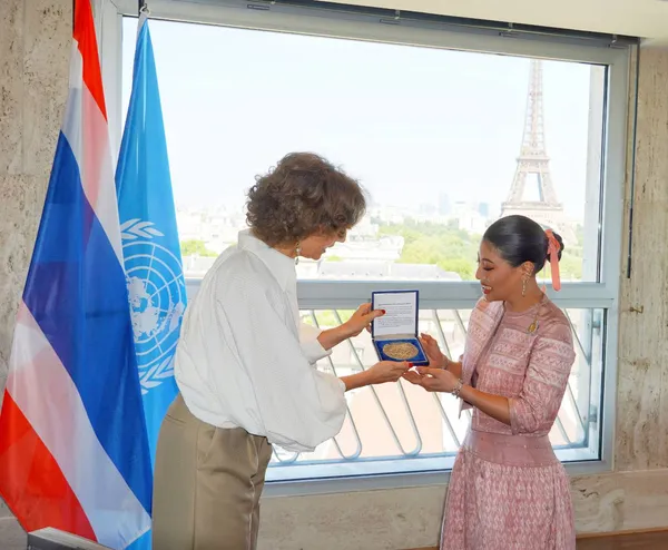 นางโอเดรย์ อาซูเลย์ ผู้อำนวยการใหญ่ องค์การยูเนสโก ประกาศเชิดชูพระเกียรติ และทูลเกล้าทูลกระหม่อมถวายเหรียญสดุดีแด่ สมเด็จพระเจ้าลูกเธอ เจ้าฟ้าสิริวัณณวรี นารีรัตนราชกัญญา ณ สำนักงานใหญ่องค์การการศึกษา วิทยาศาสตร์ และวัฒนธรรมแห่งสหประชาชาติ ณ กรุงปารีส สาธารณรัฐฝรั่งเศส เมื่อวันที่ 18 กรกฎาคม 2568