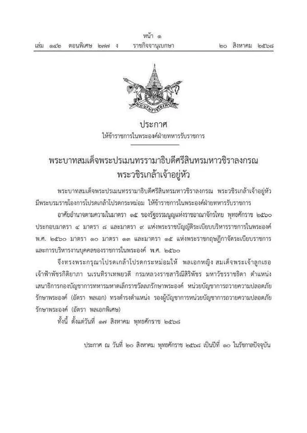 ราชกิจจานุเบกษาเผยแพร่ประกาศโปรดเกล้าฯ แต่งตั้ง พลเอกหญิง สมเด็จพระเจ้าลูกเธอ เจ้าฟ้าพัชรกิติยาภาฯ เป็นผู้บัญชาการทหารมหาดเล็กรักษาพระองค์ โดยมีผลตั้งแต่วันที่ 17 สิงหาคม 2568 เพื่อปฏิบัติหน้าที่ตามพระบรมราชโองการ