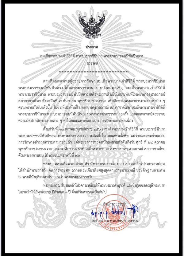 วันที่ 25 ตุลาคม 2568 ประกาศสำนักพระราชวัง เรื่อง สมเด็จพระนางเจ้าสิริกิติ์ พระบรมราชินีนาถ พระบรมราชชนนีพันปีหลวง สวรรคต ระบุว่า ตามที่คณะแพทย์ผู้ถวายการรักษา สมเด็จพระนางเจ้าสิริกิติ์ พระบรมราชินีนาถ พระบรมราชชนนีพันปีหลวง ได้ขอพระราชทานกราบบังคมทูลเชิญ สมเด็จพระนางเจ้าสิริกิติ์ พระบรมราชินีนาถ พระบรมราชชนนีพันปีหลวง เสด็จพระราชดำเนินไปประทับที่โรงพยาบาลจุฬาลงกรณ์ สภากาชาดไทย ตั้งแต่วันที่ 7 กันยายน พุทธศักราช 2562 เพื่อติดตามพระอาการทางระบบต่างๆ ความทราบทั่วกันแล้วนั้น ในช่วงที่ประทับที่โรงพยาบาลจุฬาลงกรณ์ สภากาชาดไทย สมเด็จพระนางเจ้าสิริกิติ์ พระบรมราชินีนาถ พระบรมราชชนนีพันปีหลวง ทรงพระประชวรหลายครั้ง และคณะแพทย์ตรวจพบความผิดปรกติทางระบบต่างๆ ทำให้คณะแพทย์ต้องถวายการรักษาอย่างต่อเนื่อง