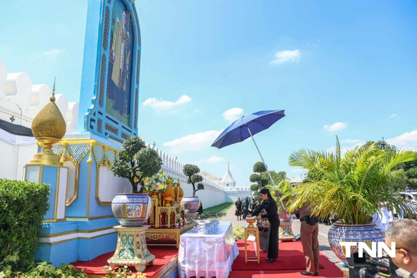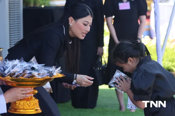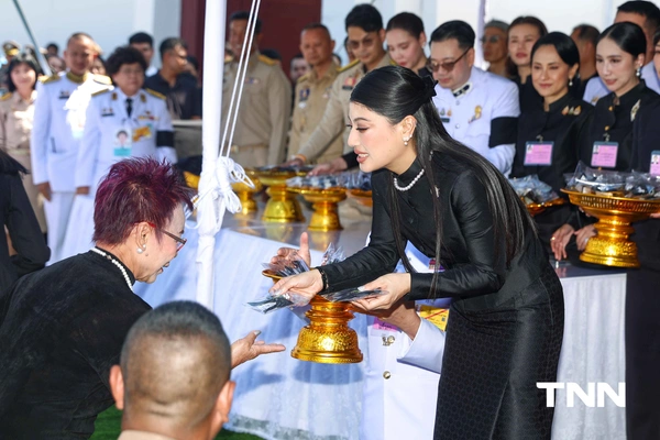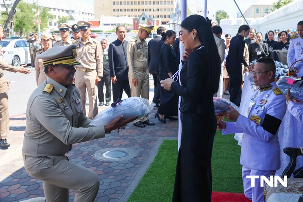 การนี้ ถวายพวงมาลัย ถวายราชสักการะ พระบรมฉายาลักษณ์ สมเด็จพระบรมชนกาธิเบศร มหาภูมิพลอดุลยเดชมหาราช บรมนาถบพิตร และเสด็จพระดำเนินไปยังจุดพระราชทานสิ่งของฯ เพื่อพระราชทานเข็มกลัดโบว์ดำแก่ประชาชนที่เดินทางมา ถวายความอาลัยเข้าเฝ้าฯ เป็นเข็มกลัดโบว์ดำ 2 แบบ แบบที่ 1 เข็มกลัดโบวว์ดำดอกไม้ในพระนามาภิไธย 'โมกราชินี' ขณะที่แบบที่ 2 เข็มกลัดโบว์ดำพรรณไม้พระราชทาน 'มณีเทวา' มีชื่อสามัญ หรือชื่อทั่วไปว่า ดอกกระดุมเงิน บางพื้นที่เรียก หญ้าหัวหงอก จำนวน 1,950 ชิ้น(เมื่อวันที่ 16 พ.ย.68)