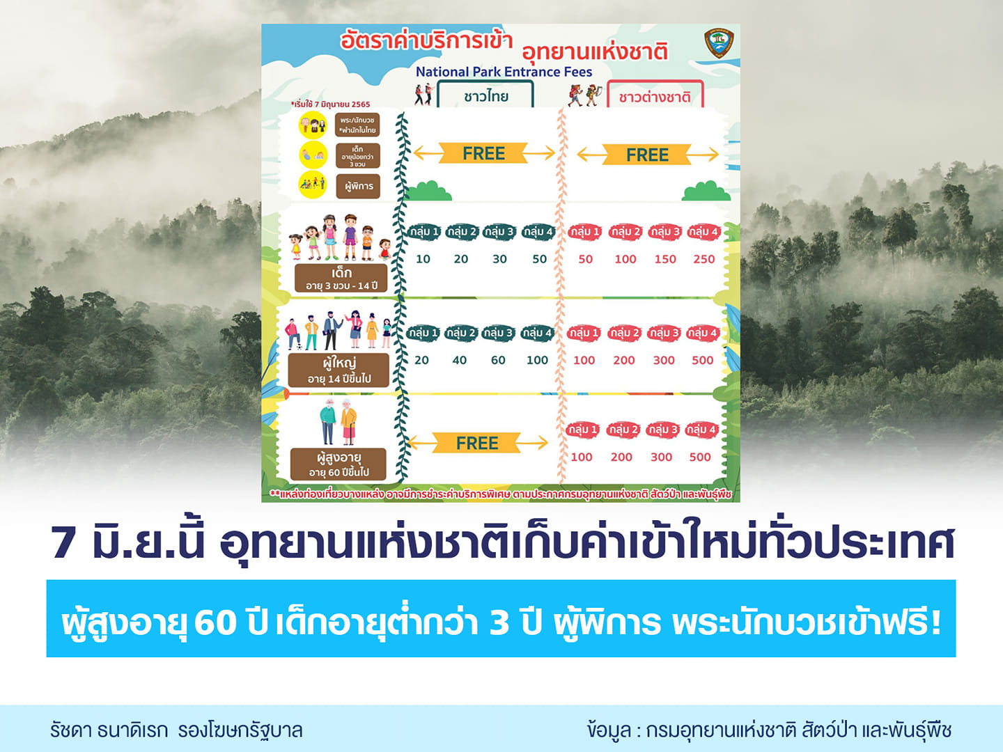 วันนี้ (6 มิ.ย.65) นางสาวรัชดา ธนาดิเรก รองโฆษกรัฐบาล เปิดเผยว่า กรมอุทยานแห่งชาติ สัตว์ป่า และพันธุ์พืช แจ้งปรับอัตราค่าเข้าอุทยานแห่งชาติทั่วประเทศ เริ่ม 7 มิถุนายน 2565 นี้ ส่วนผู้สูงอายุ 60 ปีขึ้นไปเฉพาะชาวไทย และเด็กอายุน้อยกว่า 3 ปี ผู้พิการ พระหรือนักบวชที่อยู่ในไทยเข้าฟรี โดยแบ่งอัตราค่าเข้าอุทยานแห่งชาติออกเป็น 4 กลุ่มดังนี้