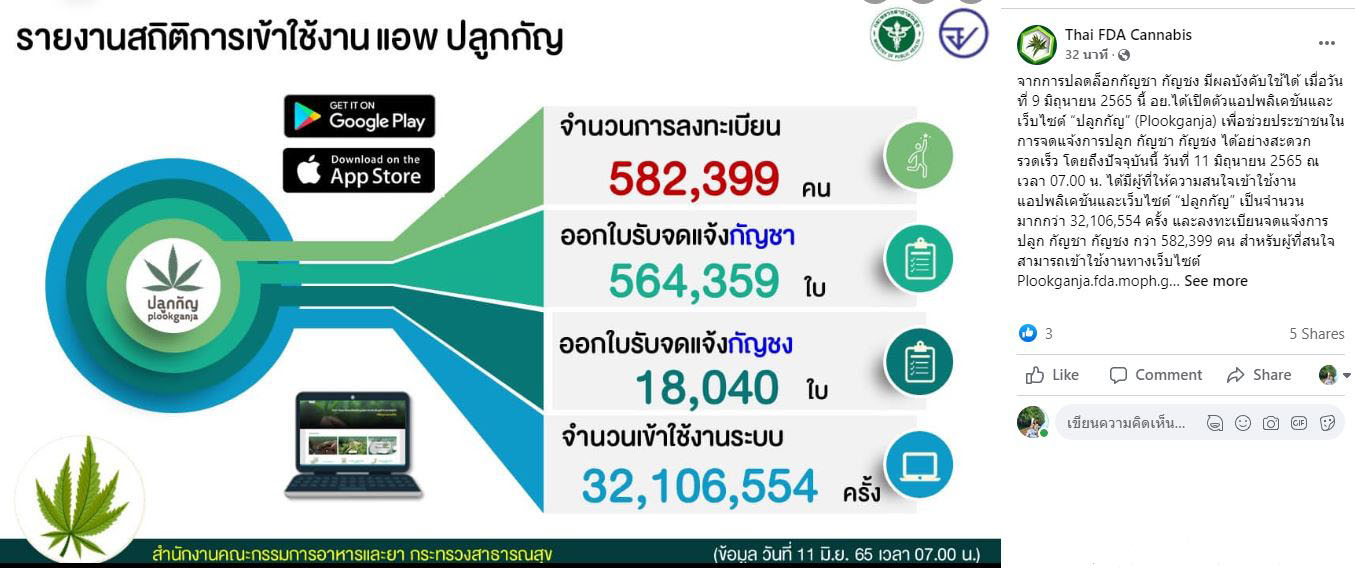 ล่าสุดเพจเฟซบุ๊ก Thai FDA Cannabis ได้อัปเดตการลงทะเบียนจดแจ้งสำหรับประชาชนดังนี้ "จากการปลดล็อกกัญชา กัญชง มีผลบังคับใช้ได้เมื่อวันที่ 9 มิถุนายน 2565 นี้ อย.ได้เปิดตัวแอปพลิเคชันและเว็บไซต์ “ปลูกกัญ” (Plookganja) เพื่อช่วยประชาชนในการจดแจ้งการปลูก กัญชา กัญชง ได้อย่างสะดวก รวดเร็ว