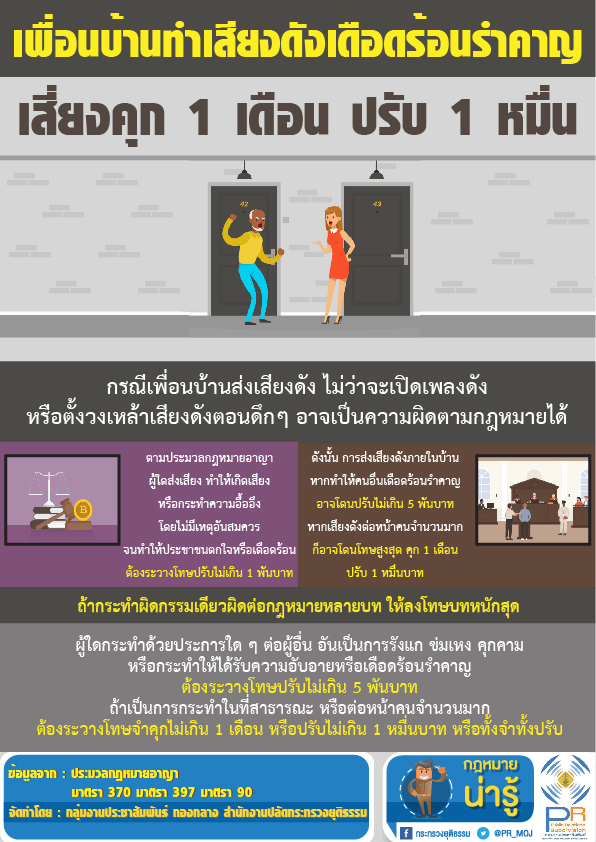 กระทรวงยุติธรรม โพสต์ข้อมูลผ่านเพจเฟซบุ๊ก กระทรวงยุติธรรม Ministry Of Justice, Thailand เกี่ยวกับปัญหา เพื่อนบ้านทำเสียงดังเดือดร้อนรำคาญ ข้อมูลจาก : ประมวลกฎหมายอาญา มาตรา 370, มาตรา 397, มาตรา 90 โดยระบุข้อความว่า เพื่อนบ้านทำเสียงดังเดือดร้อนรำคาญ เสี่ยงคุก 1 เดือน ปรับ 1 หมื่น