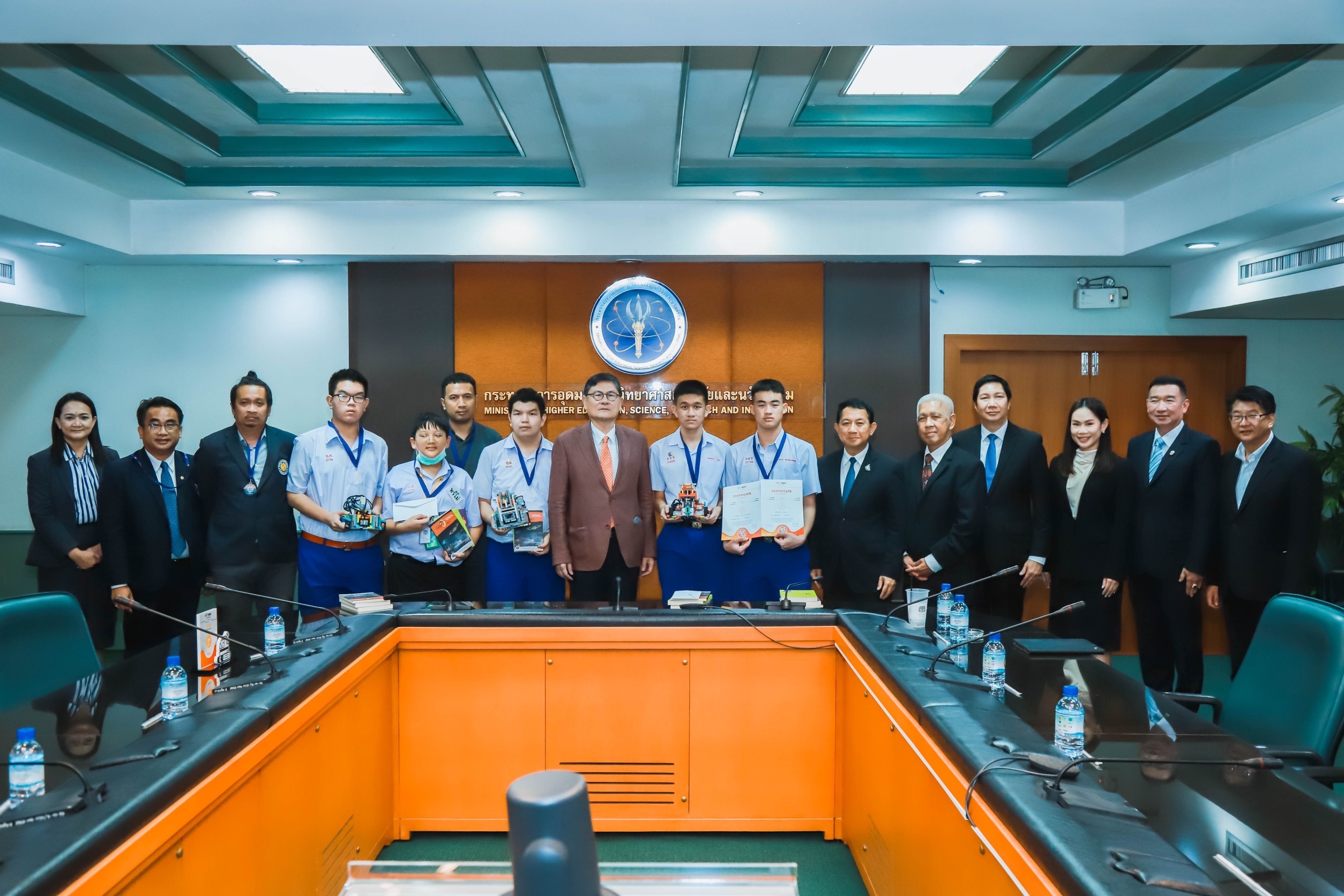 ศ.(พิเศษ) ดร.เอนก เหล่าธรรมทัศน์ รัฐมนตรีว่าการกระทรวงการอุดมศึกษา วิทยาศาสตร์ วิจัยและนวัตกรรม (อว.) ศ.ดร.นพ.สิริฤกษ์ ทรงศิวิไล ปลัดกระทรวง อว. และรศ.ดร.พาสิทธิ์ หล่อธีรพงศ์ รองปลัดกระทรวง อว. แสดงความยินดีและให้กำลังใจกับเยาวชนไทยที่คว้า 2 รางวัลใหญ่ 1 เหรียญทอง 1 เหรียญทองแดง ในการแข่งขันโอลิมปิกหุ่นยนต์ระดับนานาชาติ ประจำปี 2565 (World Robot Olympiad 2022) ในระหว่างวันที่ 17 – 19 พฤศจิกายน 2565 ณ เมืองดอร์ทมุนต์ ประเทศเยอรมนี โดยมี ผศ.ดร.รวิน ระวิวงศ์ ผู้อำนวยการองค์การองค์การพิพิธภัณฑ์วิทยาศาสตร์แห่งชาติ (อพวช.) พร้อมด้วย นายจักรริน จันทรวิสูตร ประธานกรรมการผู้จัดการ บริษัท แกมมาโก้ (ประเทศไทย) จำกัด นำทีมเยาวชนเข้าพบ