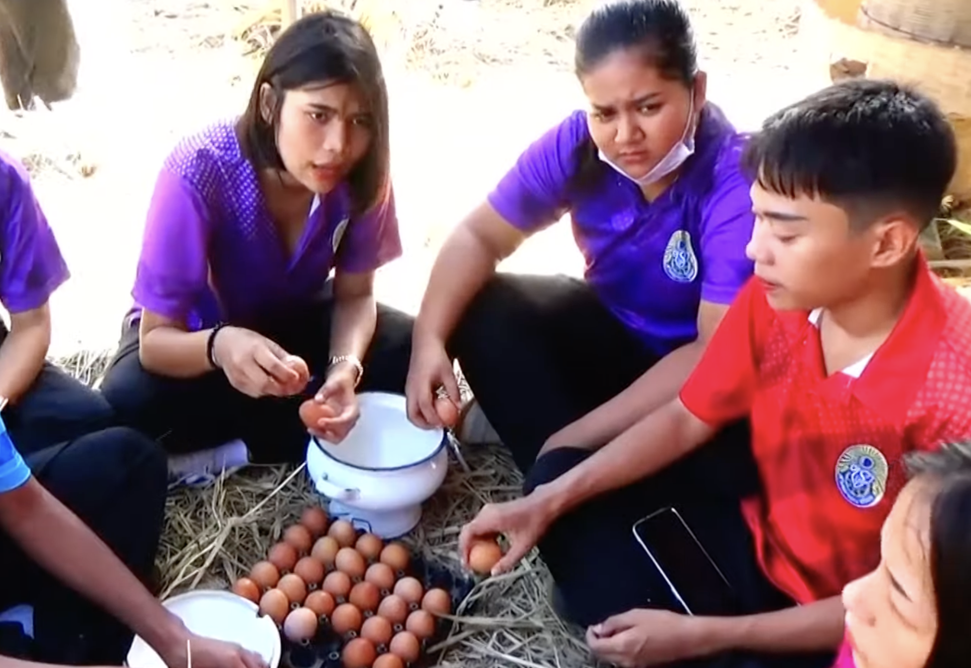 ภาพเด็ก ๆ กำลังช่วยกันตอกไข่ แล้วแยกเอาไข่ขาว และไข่แดงออกจากกัน โดยน้อง ๆ จะระวังอย่างดีไม่ให้เปลือกไข่ ทั้ง 2 แตก เพราะน้อง ๆ จะนำเอาเปลือกไข่ไปเพาะพันธุ์ต้นข้าว