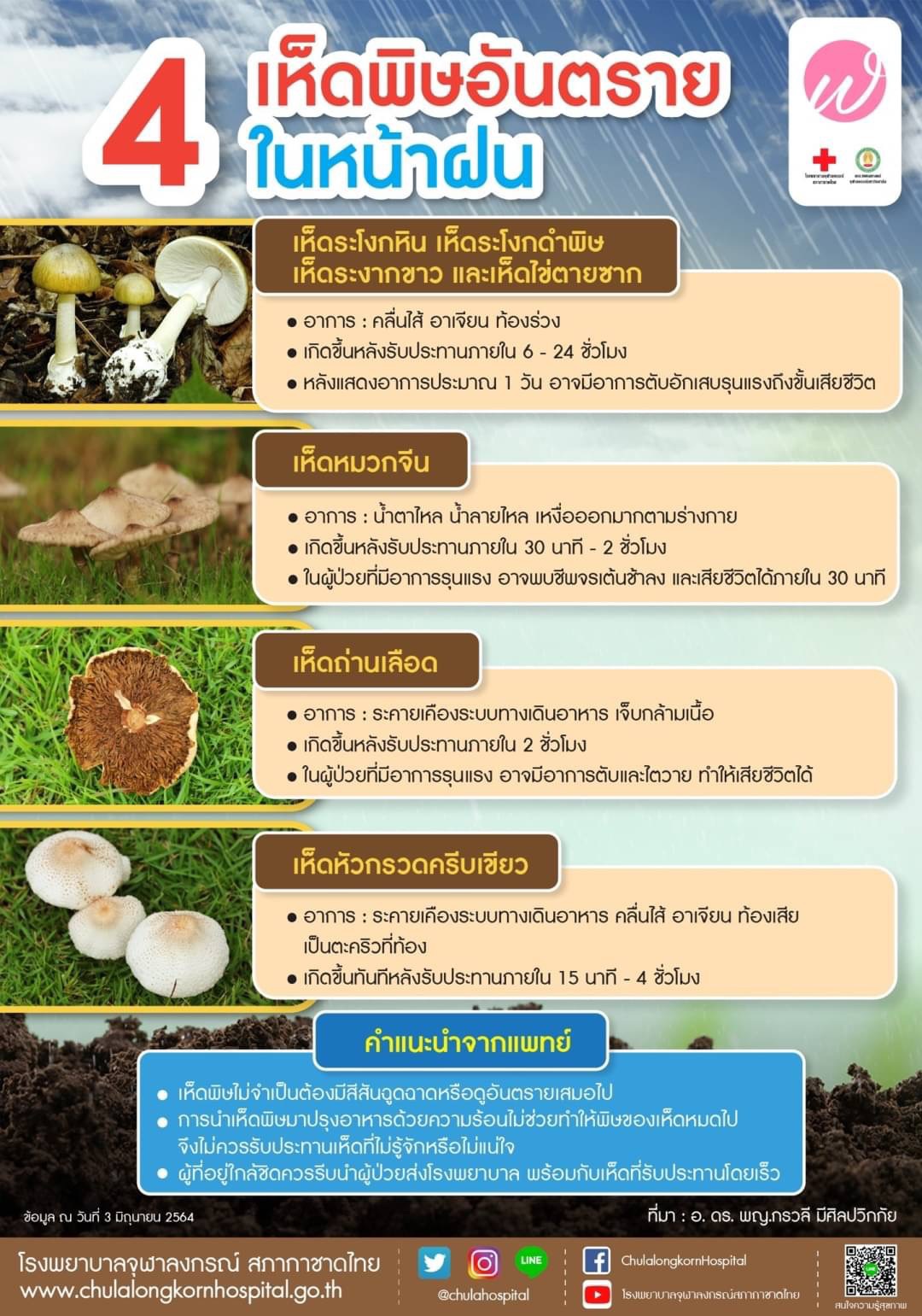 โดย โรงพยาบาลจุฬาลงกรณ์ สภากาชาดไทย ได้เผยแพร่ความรู้เกี่ยวกับ 4 เห็ดพิษอันตรายในหน้าฝน ดังนี้