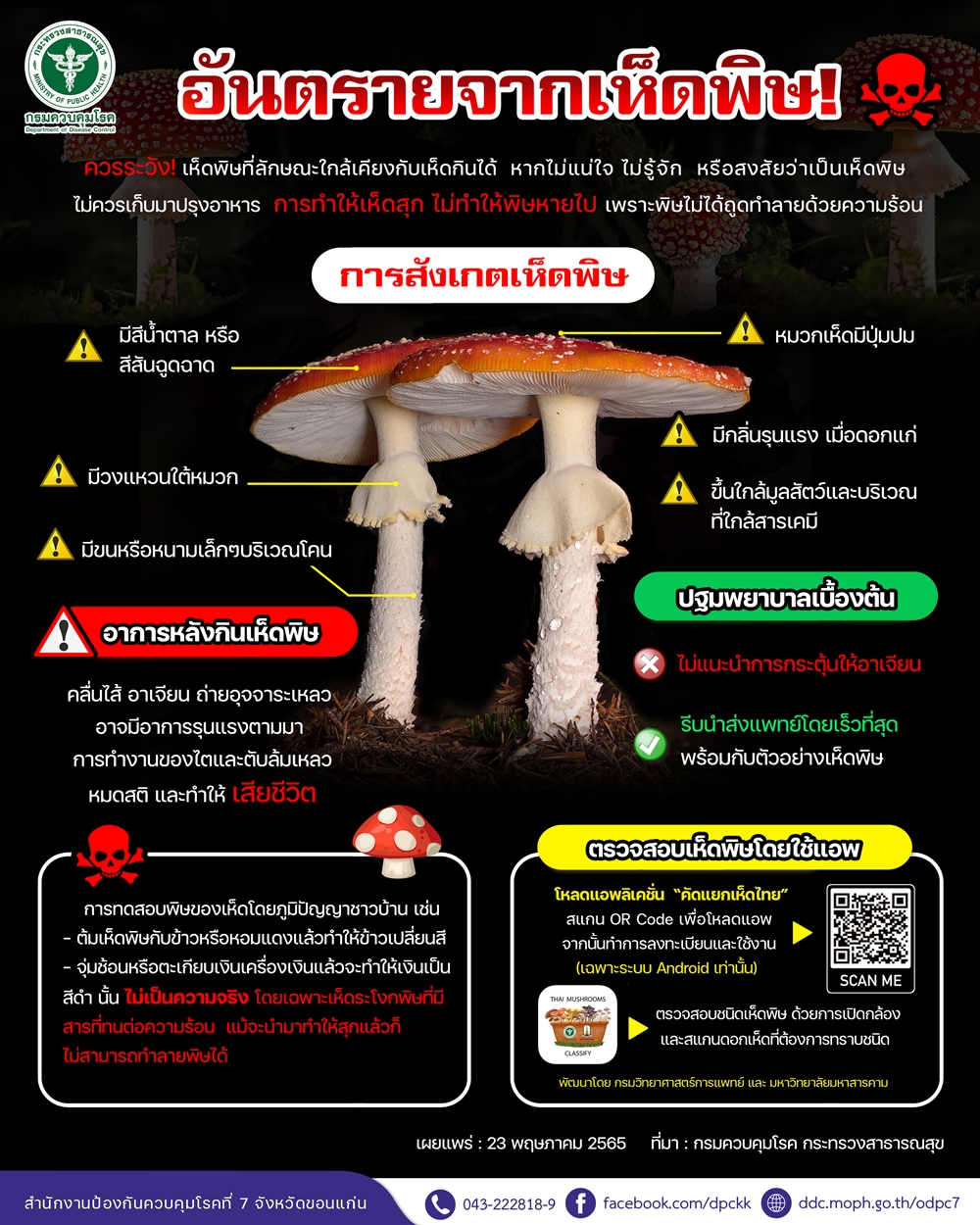 เห็ดพิษ (Mushroom poisoning) ช่วงนี้มีฝนตกลงมาหลายพื้น ทำให้เห็ดหลายชนิดเจริญเติบโตได้ดี โดยเฉพาะเห็ดป่าในพื้นที่ธรรมชาติ ซึ่งมีทั้งเห็ดกินได้ และ เห็ดพิษ กินไม่ได้ เมื่อเห็ดอยู่ในระยะดอกตูม จะมีความคล้ายคลึงกันมาก อาจทำให้ประชาชนเข้าใจผิด และนำเห็ดพิษมาปรุงประกอบอาหารได้