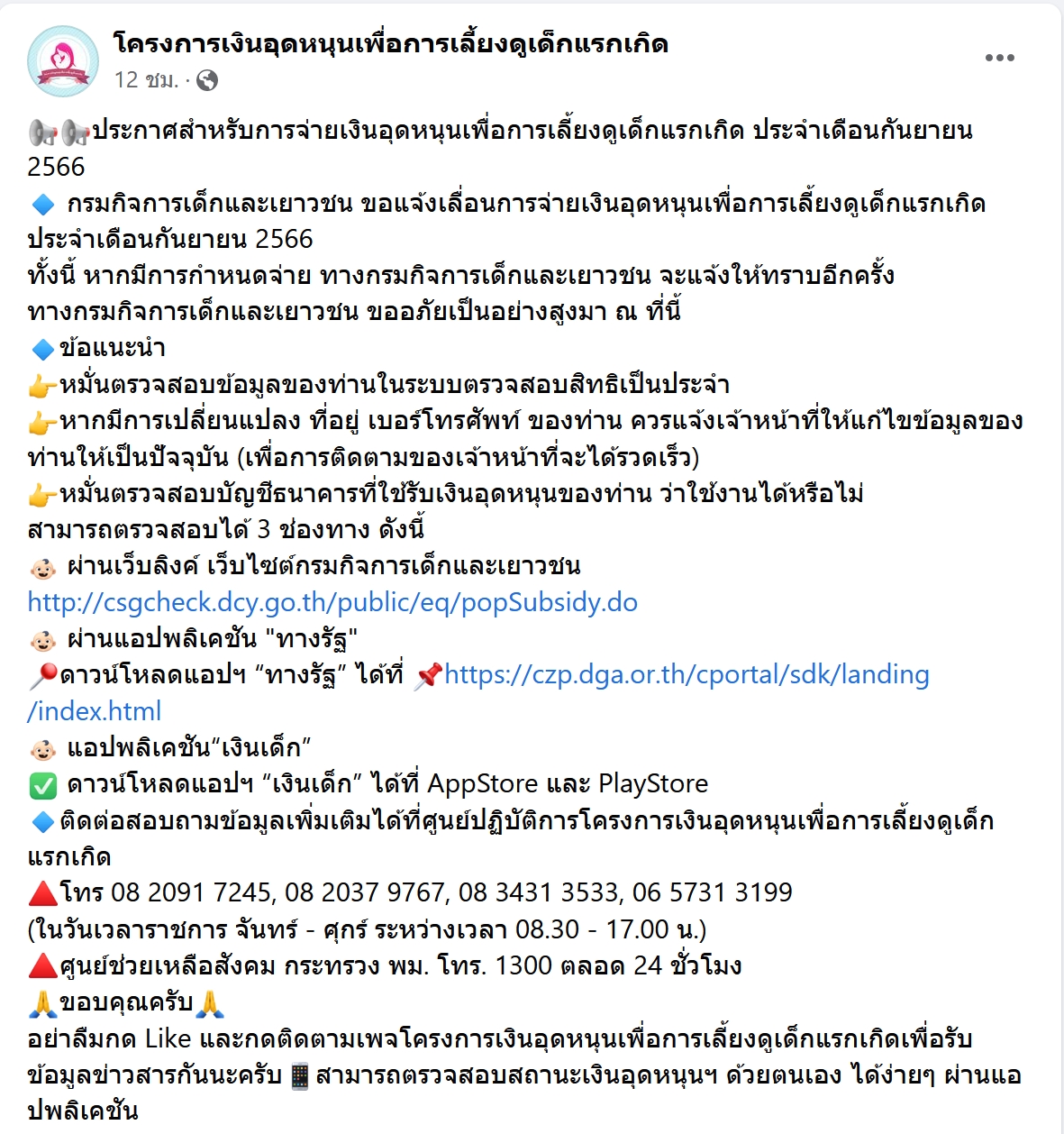 เฟซบุ๊ก โครงการเงินอุดหนุนเพื่อการเลี้ยงดูเด็กแรกเกิด แจ้งว่า ประกาศสำหรับการจ่ายเงินอุดหนุนเพื่อการเลี้ยงดูเด็กแรกเกิด ประจำเดือนกันยายน 2566
