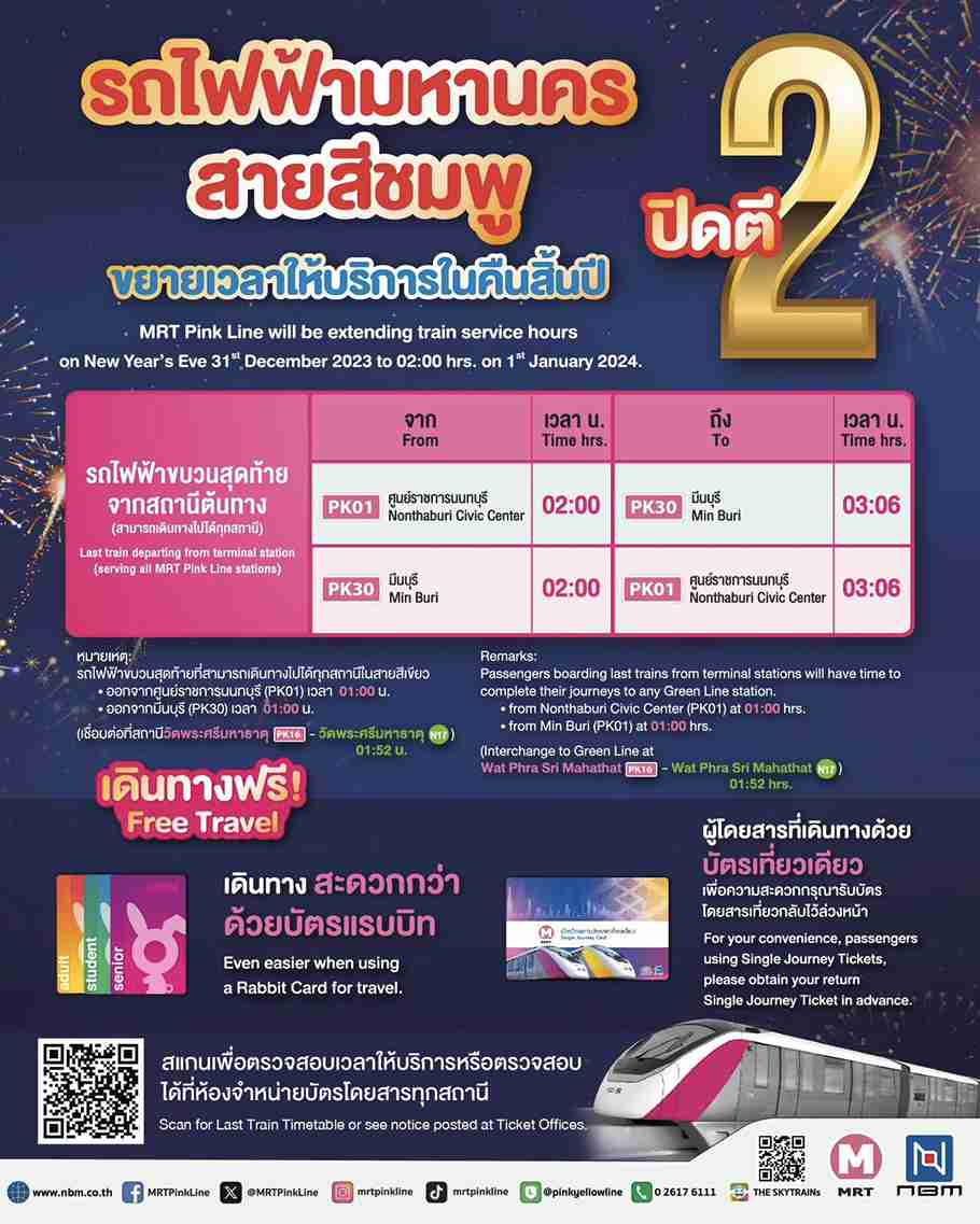 เนื่องในโอกาสเทศกาลแห่งความสุขส่งท้ายปีเก่าต้อนรับปีใหม่ 2567 บริษัทบางกอกโมโนเรล จำกัด (NBM) ผู้รับสัมปทาน รถไฟฟ้ามหานคร สายสีชมพู ร่วมกับ การรถไฟฟ้าขนส่งมวลชนแห่งประเทศไทย (MRT) ขยายเวลาให้บริการเดินรถไฟฟ้ามหานคร สายสีชมพู ทุกสถานี ในคืนวันอาทิตย์ที่ 31 ธันวาคม 2566 ถึงเวลา 02.00 น. ของวันจันทร์ที่ 1 มกราคม 256 โดยรถไฟฟ้ามหานคร สายสีชมพู ขบวนสุดท้ายจะออกจากสถานีต้นทาง เวลา 02.00 น. และขบวนสุดท้ายที่จะออกจากสถานีวัดพระศรีมหาธาตุ (PK16) ไปปลายทางสถานีมีนบุรี (PK30) เวลา 02.34 น. และไปปลายทางสถานีศูนย์ราชการนนทบุรี (PK01) เวลา 02.32 น.