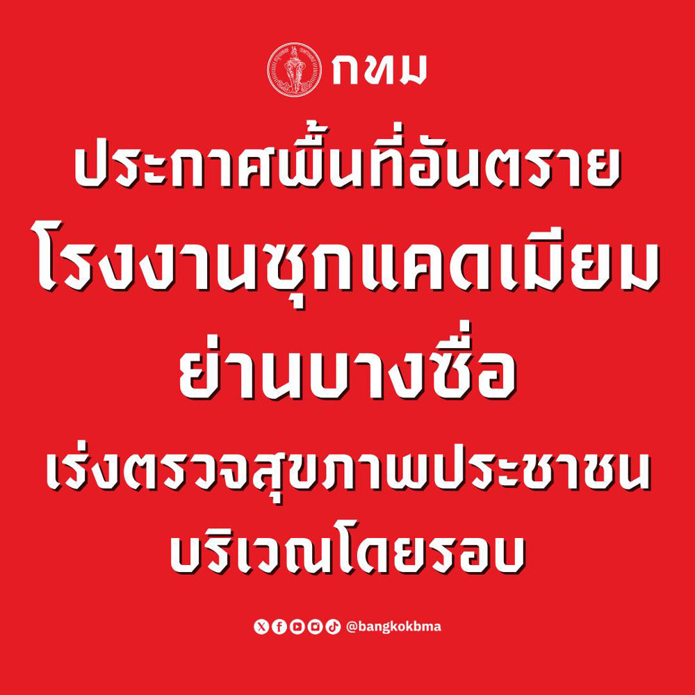 (10 เม.ย. 67) นายชัชชาติ สิทธิพันธุ์ ผู้ว่าราชการกรุงเทพมหานคร พร้อมด้วยอธิบดีกรมโรงงานอุตสาหกรรม ผู้อำนวยการสำนักป้องกันและบรรเทาสาธารณภัย ผู้อำนวยการเขตบางซื่อ ผู้อำนวยการสำนักอนามัย กทม. และเจ้าหน้าที่ที่เกี่ยวข้อง ลงพื้นที่จากกรณีเหตุตรวจพบสารเคมีประเภทกากแคดเมียมภายในบริษัท ล้อโลหะไทย เมททอล จำกัด เบื้องต้นตรวจสอบแล้วพบสารเคมี จำนวน 98 ถุง น้ำหนักประมาณ 150 ตัน ขณะนี้สำนักงานเขตบางซื่อได้ประกาศเป็นเขตพื้นที่อันตราย ห้ามอยู่อาศัยหรือดำเนินกิจการในพื้นที่ที่กำหนด เนื่องจากเป็นสารเคมีชนิดร้ายแรงและอันตรายต่อชีวิต กรุงเทพมหานครได้จัดเจ้าหน้าที่ชุดตอบโต้ภาวะฉุกเฉินสารเคมีและวัตถุอันตราย พร้อมร่วมกับกรมโรงงานอุตสาหกรรม และสำนักอนามัย เข้าดำเนินการในพื้นที่