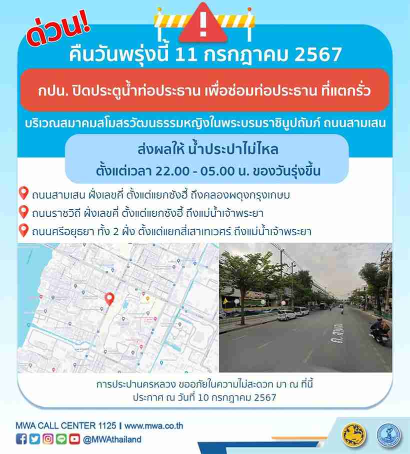 การประปานครหลวง (กปน.) มีความจำเป็นต้องปิดประตูน้ำท่อประธานขนาดเส้นผ่านศูนย์กลาง 800 มิลลิเมตร เพื่อซ่อมท่อประธาน ที่แตกรั่ว บริเวณสมาคมสโมสรวัฒนธรรมหญิงในพระบรมราชินูปถัมภ์ ถนนสามเสน ในคืนวันพรุ่งนี้ (วันพฤหัสบดีที่ 11 กรกฎาคม 2567) ตั้งแต่เวลา 22.00 - 05.00 น. ของวันรุ่งขึ้น เพื่อให้ประชาชนได้รับบริการน้ำประปาอย่างเพียงพอและทั่วถึง โดยระหว่างดำเนินการ ส่งผลให้ น้ำประปาไม่ไหล ในพื้นที่ดังต่อไปนี้