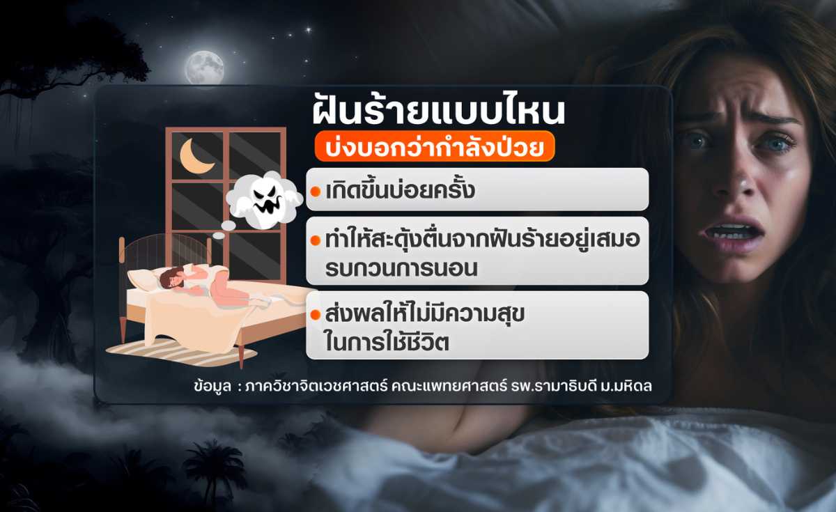 ฝันร้ายไม่ใช่ความผิดปกติเสมอไป แต่หากเกิดขึ้นบ่อยจนรบกวนชีวิตประจำวัน พบว่ามักมีสาเหตุบางอย่างที่ควรได้รับการบำบัดรักษา ข้อมูล : ภาควิชาจิตเวชศาสตร์ คณะแพทยศาสตร์โรงพยาบาลรามาธิบดี มหาวิทยาลัยมหิดล