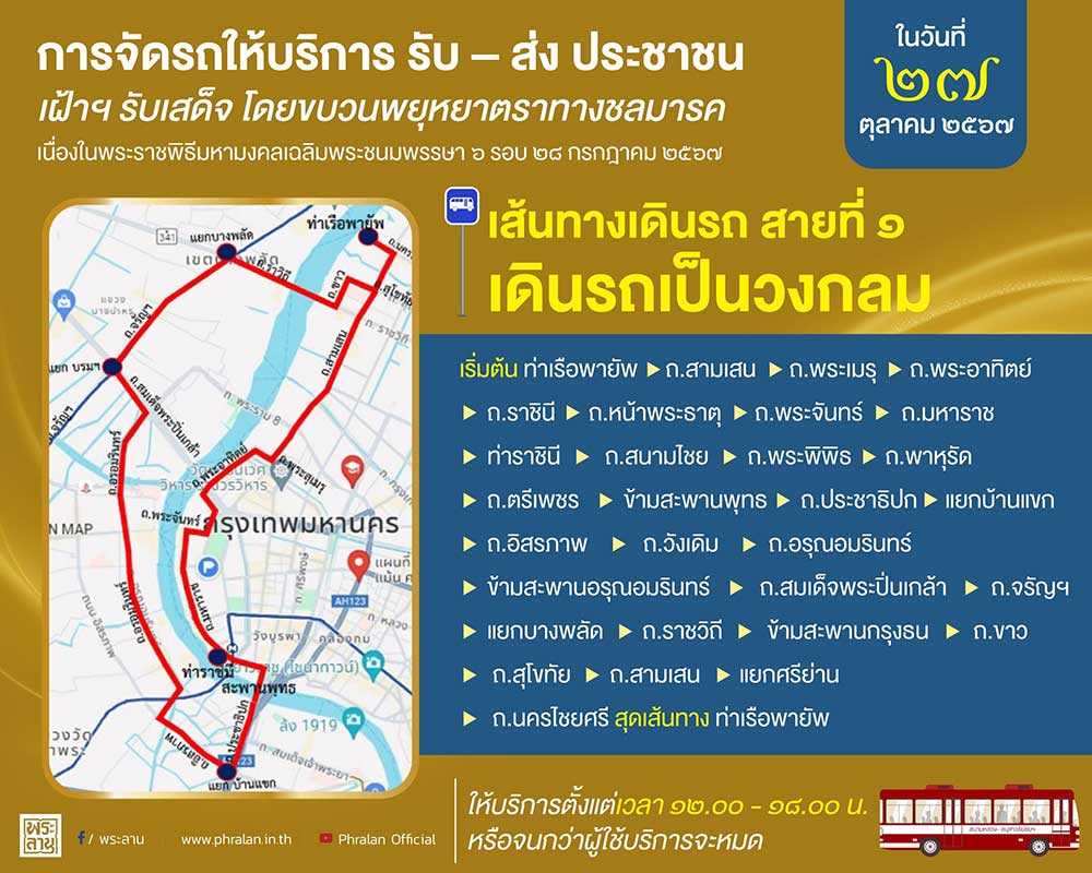 องค์การขนส่งมวลชนกรุงเทพ จัดรถโดยสารเฉพาะกิจ จำนวน 2 เส้นทาง เพื่ออำนวยความสะดวกประชาชน ในการเฝ้าฯ รับเสด็จ โดยขบวนพยุหยาตราทางชลมารค เนื่องในพระราชพิธีมหามงคลเฉลิมพระชนมพรรษา 6 รอบ 28 กรกฎาคม 2567 ในวันที่ 27 ตุลาคม 2567 ตั้งแต่เวลา 12.00 - 18.00 น. หรือจนกว่าผู้ใช้บริการจะหมด โดยไม่มีค่าใช้จ่าย