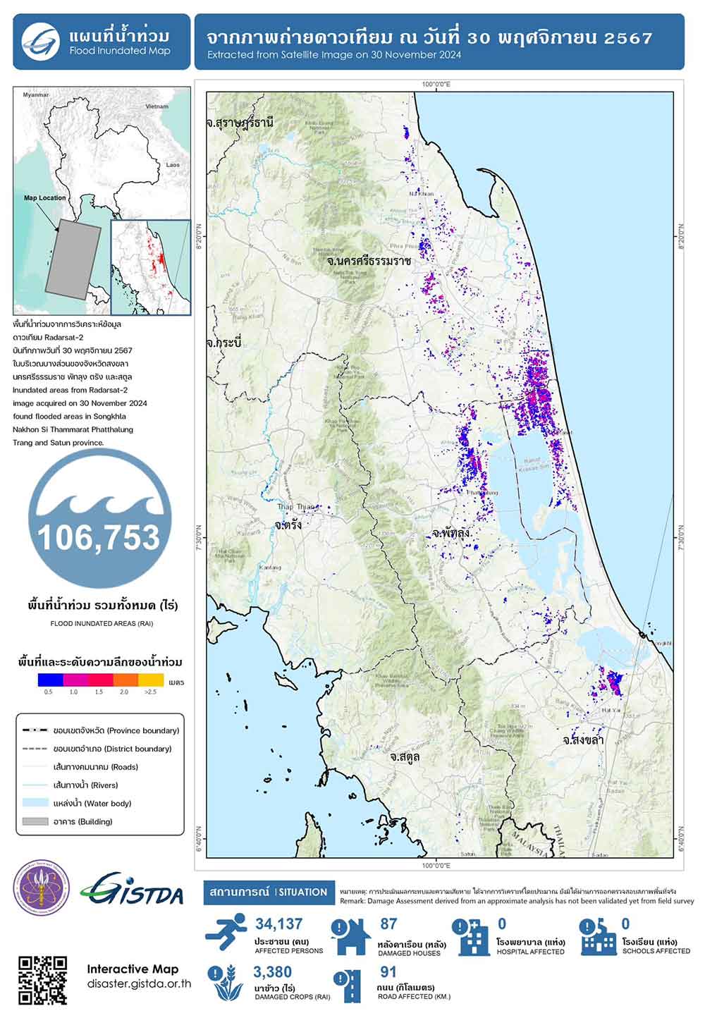 กระทรวงการอุดมศึกษา วิทยาศาสตร์ วิจัยและนวัตกรรม (อว.) โดย GISTDA สำนักงานพัฒนาเทคโนโลยีอวกาศและภูมิสารสนเทศ (องค์การมหาชน) ติดตามสถานการณ์น้ำท่วมขังภาคใต้ ด้วยข้อมูลจากดาวเทียม RADARSAT-2 เมื่อวันที่ 30 พฤศจิกายน 2567 เวลา 06:10 น. พบพื้นที่น้ำท่วมขังในบริเวณบางส่วนของ 5 จังหวัดภาคใต้ ได้แก่ สงขลา นครศรีธรรมราช พัทลุง ตรัง สตูล รวม 106,753 แสนไร่ ส่วนใหญ่เป็นพื้นที่ลุ่มเกษตรกรรม ชุมชนที่อยู่อาศัย และเส้นทางคมนาคมบางแห่ง