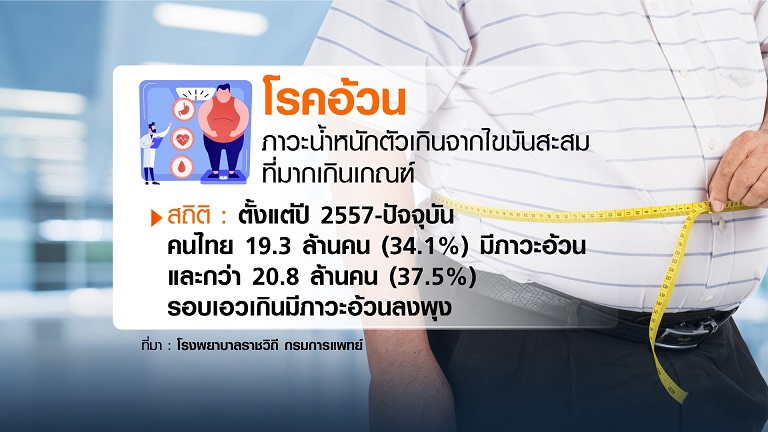 โรคอ้วนเกิดจากภาวะน้ำหนักตัวเกินจากไขมันสะสมที่มากเกินเกณฑ์ โดยข้อมูล สสส. ตั้งแต่ปี 2557 ถึงปัจจุบันพบว่าคนไทย 19.3 ล้านคน คิดเป็นร้อยละ 34.1 มีภาวะ “อ้วน” และมีคนไทยที่รอบเอวเกิน หรืออ้วนลงพุงกว่า 20.8 ล้านคน คิดเป็นร้อยละ 37.5 ซึ่งทั้ง 2 กลุ่มอาจเสี่ยงป่วยเป็นโรคในกลุ่มโรคไม่ติดต่อเรื้อรัง NCDs ได้
