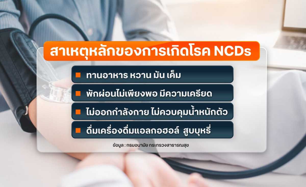 นอกจากนี้ยังเป็นปัญหาสำคัญที่ส่งผลกระทบต่อสุขภาพคนไทย โดยพบเป็นสาเหตุอันดับหนึ่งที่ทำให้คนไทยเสียชีวิต และคนไทยมากกว่า 14 ล้านคนกำลังเผชิญกับโรค NCDs / และสาเหตุหลักของการเกิดโรค NCDs คือ มาจากการรับประทานอาหาร หวาน มัน เค็ม นอนดึกพักผ่อนไม่เพียง มีความเครียด ไม่ออกกำลังกาย ไม่ควบคุมน้ำหนักตัว ดื่มเครื่องดื่มแอลกอฮอล์ สูบบุหรี่