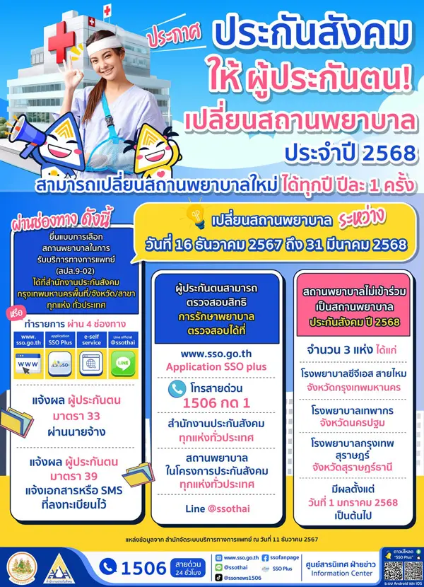 สำนักงานประกันสังคม แจ้งให้ผู้ประกันตนมาตรา 33 และมาตรา 39 สามารถเปลี่ยนสถานพยาบาลประจำปี 2568 ได้ ตั้งแต่วันที่ 16 ธันวาคม 2567 ถึงวันที่ 31 มีนาคม 2568