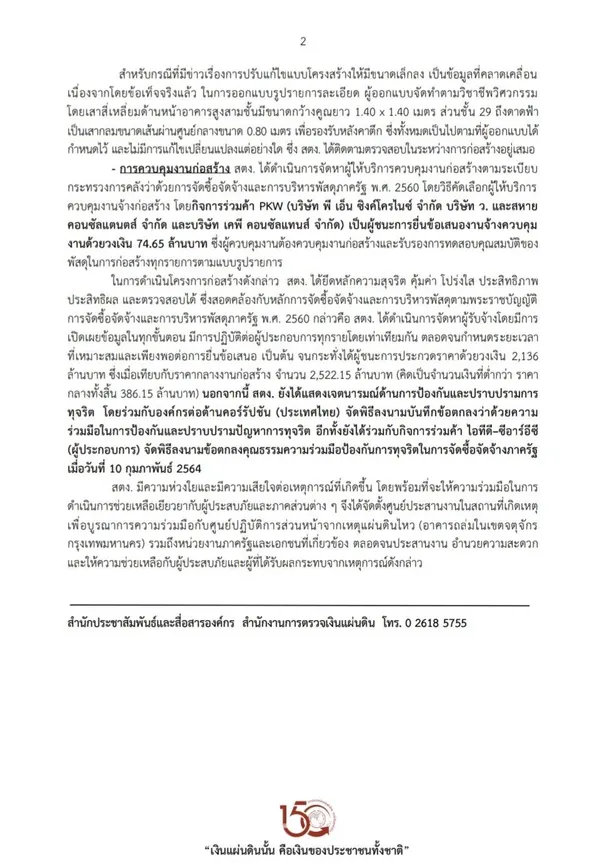 ในการดำเนินโครงการก่อสร้างดังกล่าว สตง. ได้ยึดหลักความสุจริต คุ้มค่า โปร่งใส ประสิทธิภาพประสิทธิผล และตรวจสอบได้ ซึ่งสอดคล้องกับหลักการจัดซื้อจัดจ้างและการบริหารพัสดุตามพระราชบัญญัติการจัดซื้อจัดจ้างและการบริหารพัสดุภาครัฐ พ.ศ. 2560 กล่าวคือ สตง. ได้ดำเนินการจัดหาผู้รับจ้างโดยมีการเปิดเผยข้อมูลในทุกขั้นตอน มีการปฏิบัติต่อผู้ประกอบการทุกรายโดยเท่าเทียมกัน ตลอดจนกำหนดระยะเวลาที่เหมาะสมและเพียงพอต่อการยื่นข้อเสนอ เป็นต้น จนกระทั่งได้ผู้ชนะการประกวดราคาด้วยวงเงิน 2,136 ล้านบาท ซึ่งเมื่อเทียบกับราคากลางงานก่อสร้าง จำนวน 2,522.15 ล้านบาท (คิดเป็นจำนวนเงินที่ต่ำกว่า ราคากลางทั้งสิ้น 386.15 ล้านบาท)