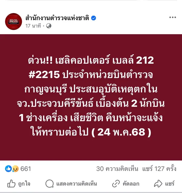 - ผบ.ตร.แสดงความเสียใจ ฮ.ตกประจวบฯ เสียชีวิต 3 นาย สั่งเยียวยา-สอบเหตุเร่งด่วน