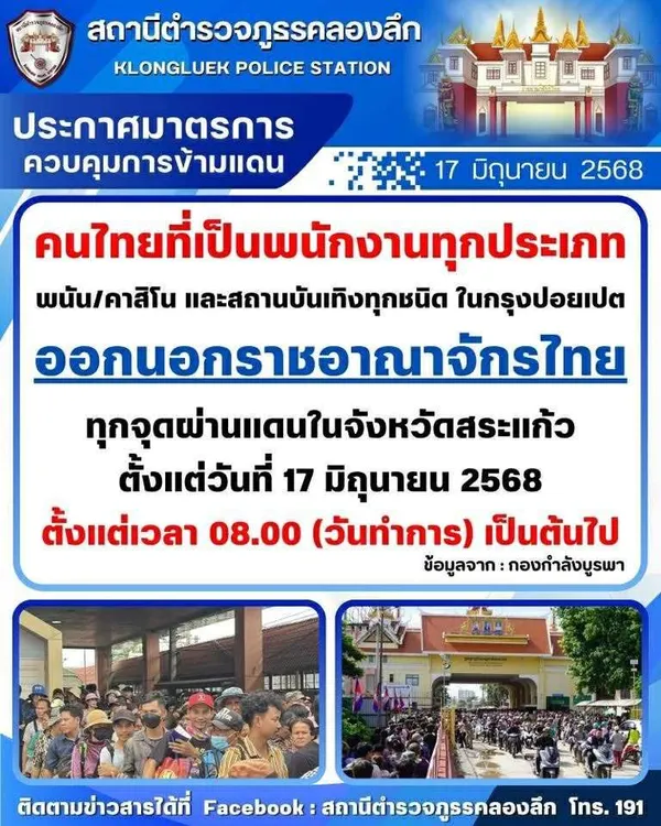 วันที่ 17 มิถุนายน 2568 กองกำลังบูรพา โดย พลตรี เบญจพล เดชะติวงศ์ ณ อยุธยา ผู้บัญชาการกองกำลังบูรพา ได้ลงนามในคำสั่งด่วนที่สุด เรื่อง “มาตรการควบคุมจุดผ่านแดนในพื้นที่จังหวัดสระแก้ว” มีเนื้อหาชัดเจนว่าให้หน่วยขึ้นตรงในพื้นที่ร่วมกันดำเนินการห้ามบุคคลสัญชาติไทยที่เป็นพนักงานในบ่อนพนัน คาสิโน หรือสถานบันเทิงทุกประเภทในฝั่งกรุงปอยเปต ประเทศกัมพูชา ออกนอกราชอาณาจักรไทย ผ่านจุดผ่านแดนถาวรทุกแห่งในจังหวัดสระแก้ว ตั้งแต่วันที่ 17 มิถุนายน 2568 เวลา 08.00 น. เป็นต้นไป จนกว่าจะมีคำสั่งเปลี่ยนแปลง
