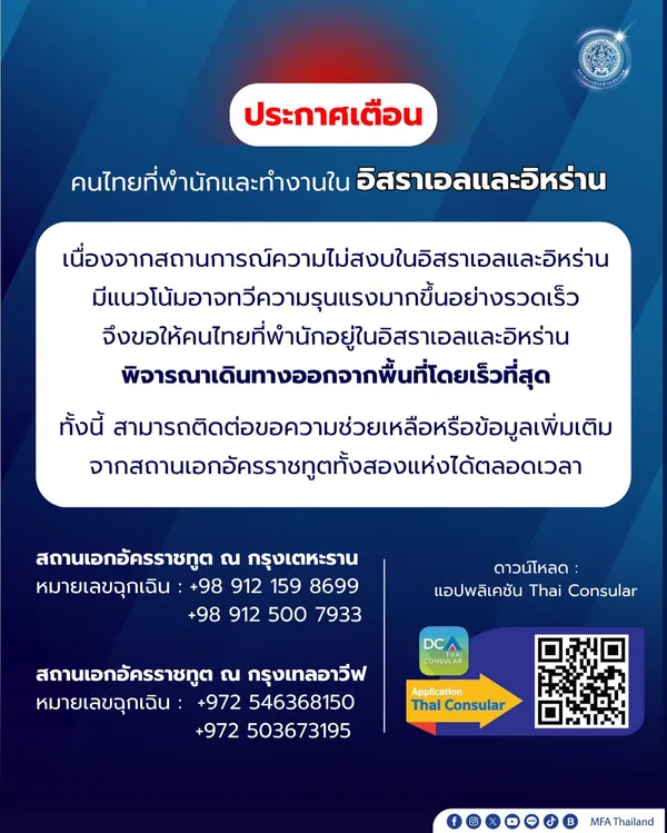 เนื่องจากสถานการณ์ความไม่สงบในอิสราเอลและอิหร่าน มีแนวโน้มอาจทวีความรุนแรงมากขึ้นอย่างรวดเร็ว จึงขอให้คนไทยที่พำนักอยู่ในอิสราเอลและอิหร่านพิจารณาเดินทางออกจากพื้นที่โดยเร็วที่สุด