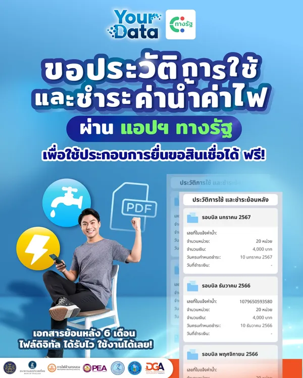 สามารถขอเอกสาร “ประวัติการใช้และชำระค่าน้ำค่าไฟรูปแบบดิจิทัล” ที่จ่ายย้อนหลัง 6 เดือนได้ ผ่านแอปพลิเคชัน “ทางรัฐ”เพื่อใช้ประกอบการยื่นขอสินเชื่อได้ ฟรี! ได้รับเอกสารไว นำไปใช้ได้เลย