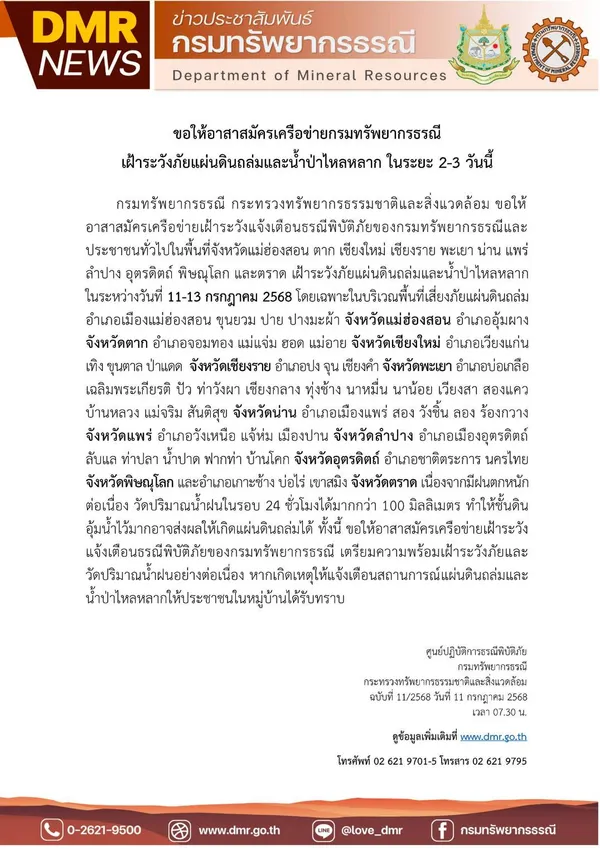 กรมทรัพยากรธรณี กระทรวงทรัพยากรธรรมชาติและสิ่งแวดล้อม ออกประกาศแจ้งเตือนเฝ้าระวังภัยแผ่นดินถล่มและน้ำป่าไหลหลากในช่วงวันที่ 11–13 กรกฎาคม 2568 โดยเน้นย้ำพื้นที่เสี่ยงในภาคเหนือและภาคตะวันออก โดยเฉพาะจังหวัดที่มีฝนตกหนักและต่อเนื่อง