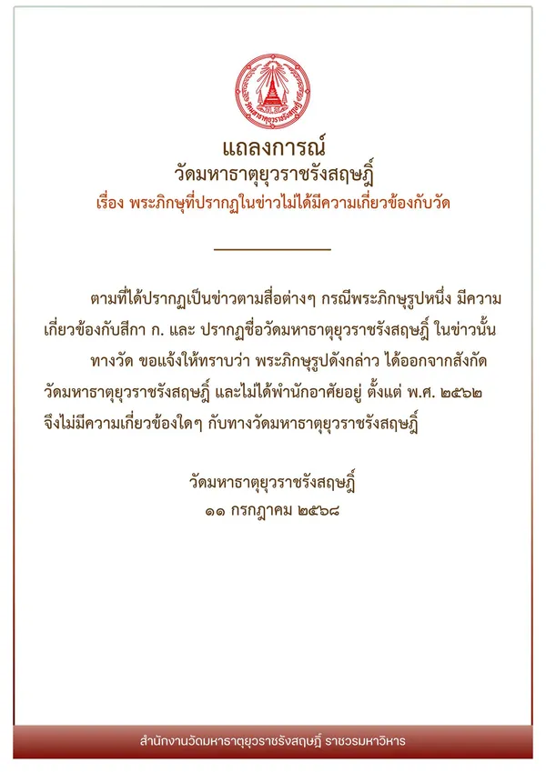 วัดมหาธาตุยุวราชรังสฤษฎิ์ ได้ออกแถลงชี้แจงว่า พระภิกษุที่ปรากฏชื่อในข่าวกับสีกาก. ได้ออกจากการสังกัดวัดมหาธาตุฯ ไปตั้งแต่ปี พ.ศ. 2562 และมิได้พำนักอยู่ภายในวัดนับแต่นั้นเป็นต้นมา ดังนั้น ทางวัดจึงขอยืนยันว่า “ไม่มีความเกี่ยวข้องใด ๆ กับพระรูปดังกล่าว”