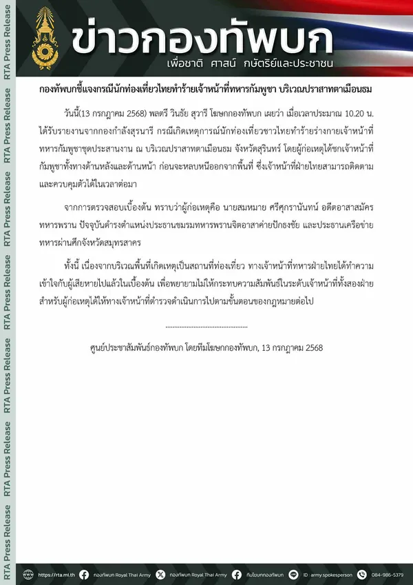 พลตรี วินธัย สุวารี โฆษกกองทัพบก เผยว่า เมื่อเวลาประมาณ 10.20 น.ได้รับรายงานจากกองกำลังสุรนารี กรณีเกิดเหตุการณ์นักท่องเที่ยวชาวไทยทำร้ายร่างกายเจ้าหน้าที่ทหารกัมพูชาชุดประสานงาน ณ บริเวณปราสาทตาเมือนธม จังหวัดสุรินทร์ โดยผู้ก่อเหตุได้ชกเจ้าหน้าที่กัมพูชาทั้งทางด้านหลังและด้านหน้า ก่อนจะหลบหนีออกจากพื้นที่ ซึ่งเจ้าหน้าที่ฝ่ายไทยสามารถติดตามและควบคุมตัวได้ในเวลาต่อมา