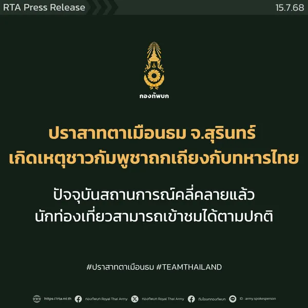 แม่ทัพภาคที่ 2 ยืนยันว่า สถานการณ์ในพื้นที่ไม่มีเหตุรุนแรง เป็นเพียงความเข้าใจผิด และสามารถคลี่คลายได้ภายในเวลาไม่นาน โดยปัจจุบันนักท่องเที่ยวสามารถเข้าชมปราสาทตาเมือนธมได้ตามปกติ พร้อมขอให้ประชาชนใช้วิจารณญาณในการรับข้อมูล และอย่าตื่นตระหนกกับข่าวที่อาจสร้างความเข้าใจคลาดเคลื่อน