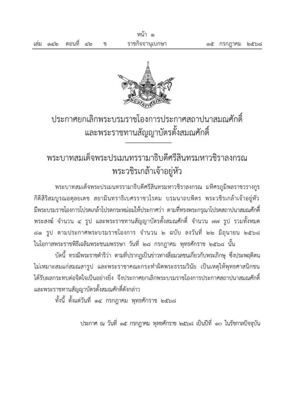 เมื่อวันที่ 15 กรกฎาคม 2568 เว็บไซต์ราชกิจจานุเบกษาเผยแพร่ประกาศยกเลิกพระบรมราชโองการเกี่ยวกับการสถาปนาสมณศักดิ์และพระราชทานสัญญาบัตรสมณศักดิ์แก่พระสงฆ์รวม 81 รูป โดยพระบาทสมเด็จพระปรเมนทรรามาธิบดีศรีสินทรมหาวชิราลงกรณ พระวชิรเกล้าเจ้าอยู่หัว ทรงมีพระบรมราชโองการโปรดเกล้าฯ ให้ยกเลิกประกาศเดิมที่ลงวันที่ 22 มิถุนายน 2568