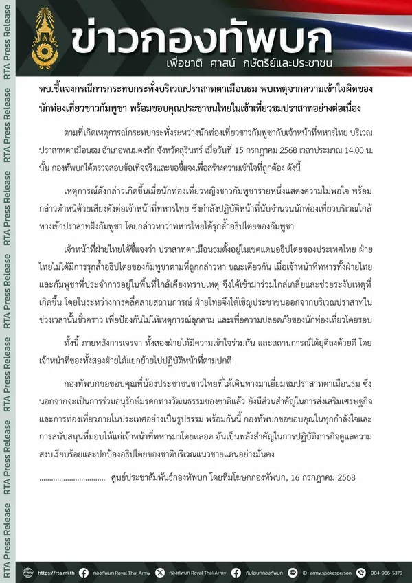 ตามที่เกิดเหตุการณ์กระทบกระทั่งระหว่างนักท่องเที่ยวชาวกัมพูชากับเจ้าหน้าที่ทหารไทย บริเวณปราสาทตาเมือนธม อำเภอพนมดงรัก จังหวัดสุรินทร์ เมื่อวันที่ 15 กรกฎาคม 2568 เวลาประมาณ 14.00 น. นั้น กองทัพบกได้ตรวจสอบข้อเท็จจริงและขอชี้แจงเพื่อสร้างความเข้าใจที่ถูกต้อง ดังนี้