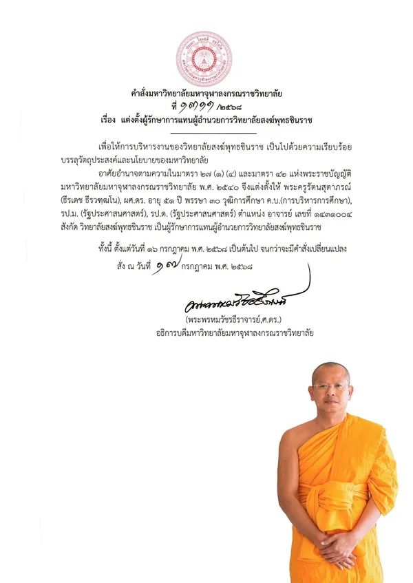 มหาวิทยาลัยมหาจุฬาลงกรณราชวิทยาลัย (มจร.) มีคำสั่งที่ 1311/2568 เรื่องการแต่งตั้งผู้รักษาการแทนผู้อำนวยการวิทยาลัยสงฆ์พุทธชินราช เพื่อให้การบริหารงานภายในเป็นไปอย่างเรียบร้อย และขับเคลื่อนตามวัตถุประสงค์และนโยบายของมหาวิทยาลัย