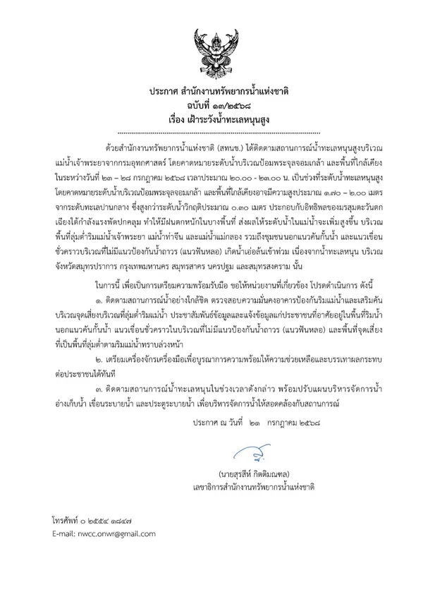 สำนักงานทรัพยากรน้ำแห่งชาติ (สทนช.) ได้ติดตามสถานการณ์น้ำทะเลหนุนสูงบริเวณแม่น้ำเจ้าพระยา จากกรมอุทกศาสตร์ โดยคาดหมายระดับน้ำบริเวณป้อมพระจุลจอมเกล้า และพื้นที่ใกล้เคียง ในระหว่างวันที่ 23 - 28 กรกฎาคม 2568 เวลาประมาณ 20.00 - 23.00 น. เป็นช่วงที่ระดับน้ำทะเลหนุนสูง โดยคาดหมายระดับน้ำบริเวณป้อมพระจุลจอมเกล้า และพื้นที่ใกล้เคียงอาจมีความสูงประมาณ 1.70 - 2.00 เมตร จากระดับทะเลปานกลาง ซึ่งสูงกว่าระดับน้ำวิกฤติประมาณ 0.30 เมตร